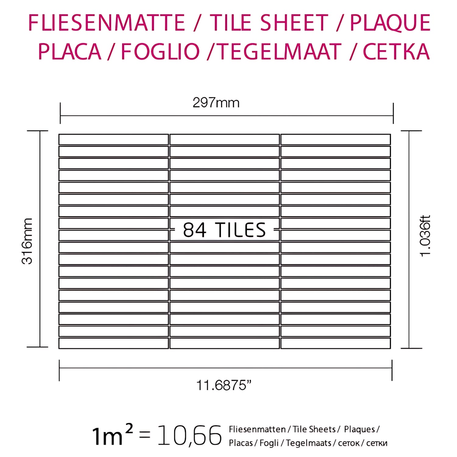 Pièces / Tesselles: 84 Pcs. par Plaque / 100 x 10 mm | 1 Paquet à 10 Plaques = 0,94 m2