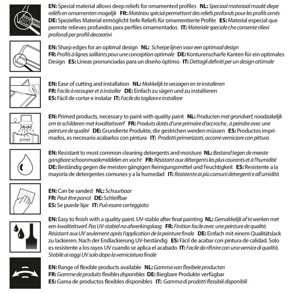 Outre son design Ultraordinaire, Orac LUXXUS se caractérise par sa qualité impeccable. Les profilés sont produits en Purotouch®, une mousse solide super-comprimée de polyuréthane. Ce matériau a la même densité que le bois et une surface homogène et lisse. Tous les motifs, éléments décoratifs et arêtes sont précis et à angles vifs.